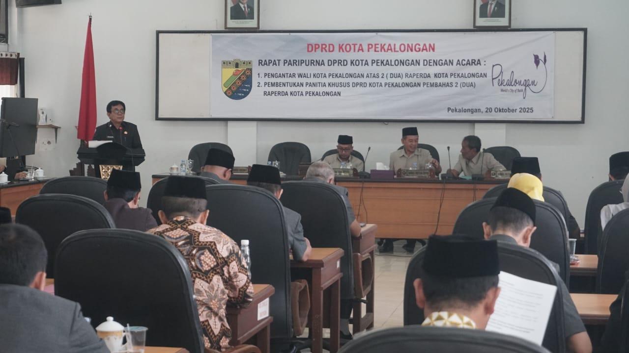 Kota Pekalongan – DPRD Kota Pekalongan menggelar rapat paripurna dengan agenda pengantar Wali Kota atas dua Rancangan Peraturan Daerah (Raperda) di Rapat Paripurna DPRD setempat, Gedung Diklat Kota Pekalongan, Senin (20/10/2025). Dua raperda yang dibahas yakni pencabutan sejumlah peraturan daerah yang sudah tidak relevan serta penyertaan modal pemerintah daerah kepada beberapa Badan Usaha Milik Daerah (BUMD).
