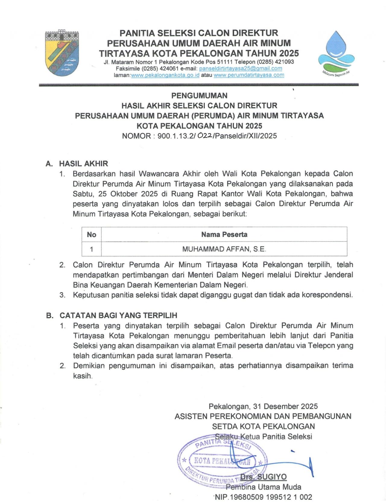 Pengumuman Pengumuman Hasil Seleksi Administrasi Calon Direktur Perumda Air Minum Tirtayasa Kota Pekalongan TIM KOMUNIKASI PUBLIK 14 Oktober 2025